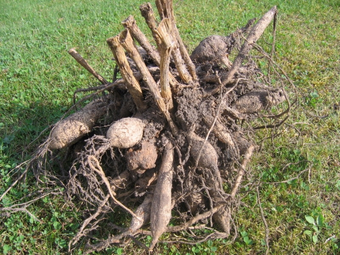 Zuerst müssen die großen Knollen geteilt werden: ich klopfe zuerst die Erde ab und versuche dann durch Drehbewegungen die Knollenteile auseinander zu ziehen. Manche fallen fast von selbst auseinander, oder man muß die Knollenteile erwas auseinandersortieren, als letzte Möglichkeit gibt es noch das scharfe Messer. |