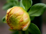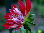 ein optimales Wachswetter für die Dahlien. Sehr vielversprechend geht die Blüte der 'Hapet Red King' auf, unten sind die Blütenblätter gelb, oben dann ganz blutrot.