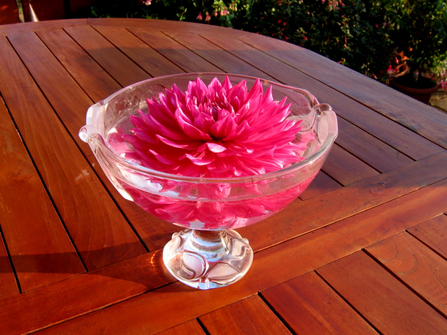 Eine Blüte im Wasser als Tischschmuck auf der Terrasse ist sehr schön und praktisch, da kein Windstoß dem Glas etwas anhaben kann.