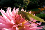 Heute hatten wir einen ganz besonderen Gast bei den Dahlien, eine große Heuschrecke. Sie hat vor allem die Spitzen der Dahlienblüten angeknabbert.